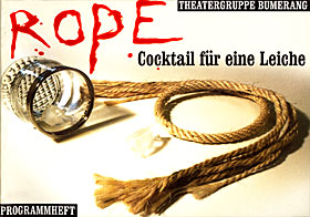 Diese Produktion stellte in erster Linie ein postmodernes Experiment dar: 1948 hatte der geniale Filmregisseur Alfred Hitchcock die Tragödie „Rope“ des seinerzeit berühmten Dramatikers Patrick Hamilton für eine filmische Umsetzung adaptiert, wobei er versuchte, das Theaterstück auch in seiner Form zu übernehmen: Hitchcock führte das Experiment eines Filmes mit durchgehenden Kamerafahrten, aber ohne Schnitt durch, um ein möglichst dichtes Authentizitätserlebnis zu ermöglichen. Wir versuchten mit unserer Adaption des Films, diesen wieder auf die Bühne zu holen und das Drama Hamiltons um filmische Techniken zu bereichern. Da hierbei der technische Aspekt im Vordergrund stand (z.B. die Gestaltung von Parallelszenen und –Dialogen), konzentrierten wir uns weniger auf eine Weiterarbeit an unserem Dramenkonzept, das tendenziell einer überkommenen Einfühlungsintention verhaftet blieb. Wir verzichteten jedoch bereits auf die Anlage einer positiven Identifikationsfigur auf der Bühne und legten so bereits einen dekonstruktivistischen Akzent an.