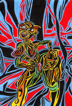 Betrachtet man die Malereien Eva Volks flüchtig, so scheint ihr Werk in zwei Richtungen zu zerfallen: Offensichtlich unrealistische Bilder, die von grotesken Gestalten bevölkert sind, und Bilder eher klassischer Prägung, die Personen in Portraits darstellen. Gerade diese Portraits aber, die scheinbar dem Betrachter weniger Widerstand entgegenbringen, hinterlassen ein Gefühl der Unstimmigkeit, das entweder zu einem schnellen, eher abschätzigen Urteil führt oder aber zu einer erneuten, näheren Betrachtung. Und dabei fällt ins Auge, dass die dargestellten Körper so nicht funktionieren; stets fügt sich zumindest ein Körperteil nicht zum Ganzen, wie beispielsweise bei dem Portrait eines Frauenkopfes der Arm nicht zum restlichen Körper passt. Imaginiert man den restlichen Arm unter Einbezug seiner dimensionalen Verkürzung, so müsste die Schulter unnatürlich weit vorne oben liegen, der Arm selbst überlang sein. Die Identität des Körpers, die der erste Blick nahe legt, wird zerstört, es bleibt in der Schwebe, ob hier eine oder zwei Personen dargestellt werden. Die Auflöseerscheinungen begegnen wieder in der Hand, die auf der Stirn gleichsam verwischt und den Ringfinger nur noch durch seine Einbindung in die Umgebung als Finger kenntlich macht. Ausgehend von der Gesichtsmitte, die Nase und Augen sehr plastisch herausarbeitet, verflacht das Bild immer mehr nach außen hin, wo die Ohren gänzlich wegfallen und der Hinter-grund auf derselben Ebene wie der Vordergrund zu liegen kommt. Die Haare schließlich gleichen eher einer Badehaube und sind in ihrer Plastizität nicht einmal mehr angedeutet. Das Auffinden dieser Unstimmigkeiten wirft den Betrachter immer wieder auf sich selbst zurück; der erste Eindruck einer Körperidentität erweist sich als Konstruktion des Betrachters, die über mannigfaltige Störungen hinwegsehen muss; das Po-stulat eines zweiten Körpers links vor dem dargestellten Kopf (und damit tendenziell im Raum des Betrachters) bricht eine Deu-tungsvielfalt der dargestellten Szene auf, die wiederum der Betrachter in Kohärenz bringen muss (was im Einzelnen sehr unterschiedlich ausfallen kann). Besonders deutlich wird dieses Zurückwerfen des Betrachters auf sich selbst bei den weiblichen Akten, deren Kopf abgeschnitten ist: Eine nackte Frau mit geöffneten Beinen ohne Kopf – das ist doch das reine Sexobjekt, der Lustkörper, dem mit Gesicht und Augen Personalität und Seele genommen wurde – ein Skandal, Pornographie! Oder, da der weibliche Vorname der Künstlerin sie vor dem Vorwurf männlichen Chauvinismus’ bewahrt, gerade die Kritik an der pornographischen Verzweckung des weiblichen Körpers? Aber was, wenn sie sich selbst gerne am Anblick nackter weiblicher Tatsachen ergötzt?